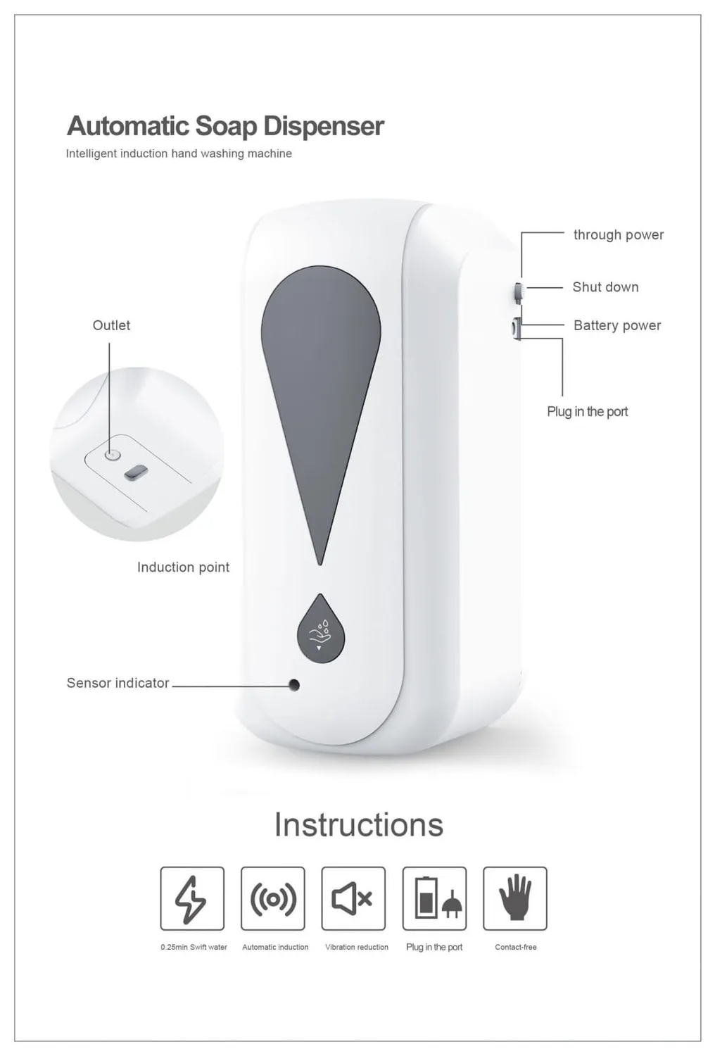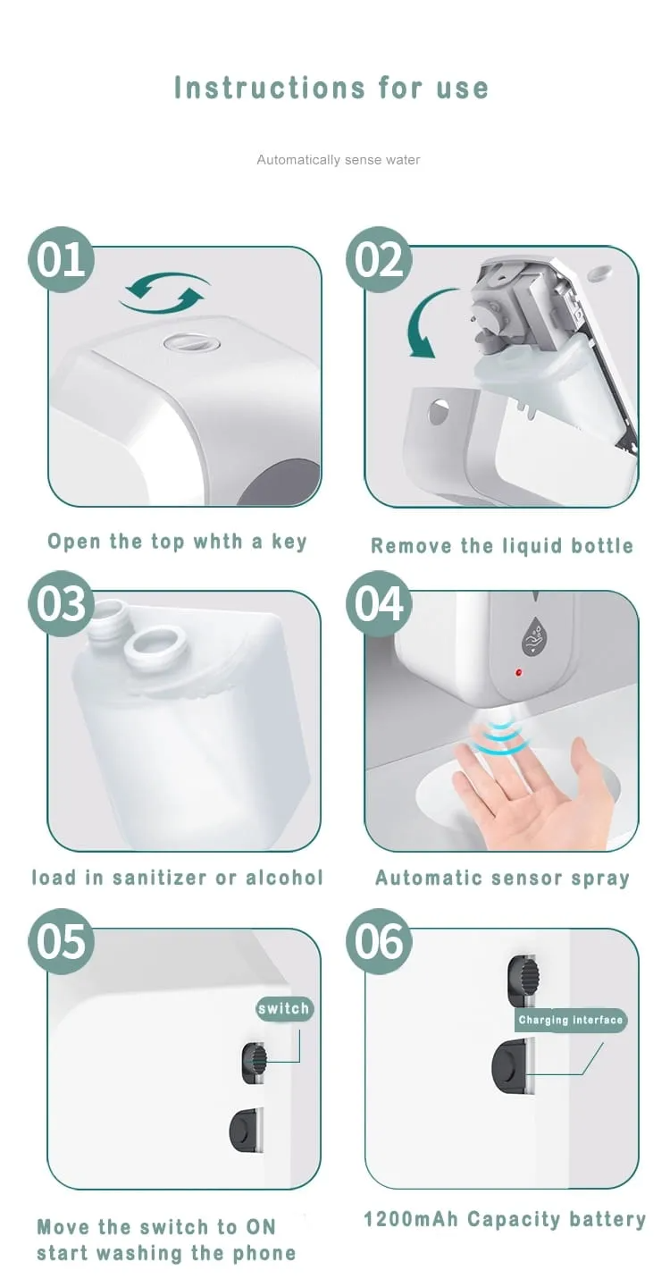 Automatyczny podajnik płynu do dezynfekcji w sprayu w obudowie z białego tworzywa ABS. Odporny na uderzenia. Posiada wbudowany zamknięty zbiornik na płyn dezynfekcyjny. Dozownik na czujkę, zamykany na kluczyk. Okienko do podglądu ilości mydła. Obudowa wodoodporna.