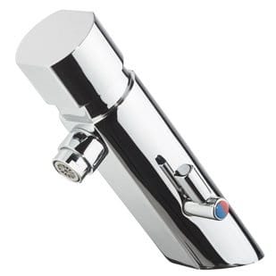 Bateria czasowa umywalkowa z mieszaczem ręcznym na wodę zimną i ciepłą. Korpus baterii jest wykonany z mosiądzu pokrytego chromem. W bocznej części korpusu znajduję się dźwignia do zmiany temperatury wypływającej wody. W górnej części korpusu (przy przycisku uruchamiającym przepływ wody) znajduję się wylewka z sitkiem regulującym strumień wody.