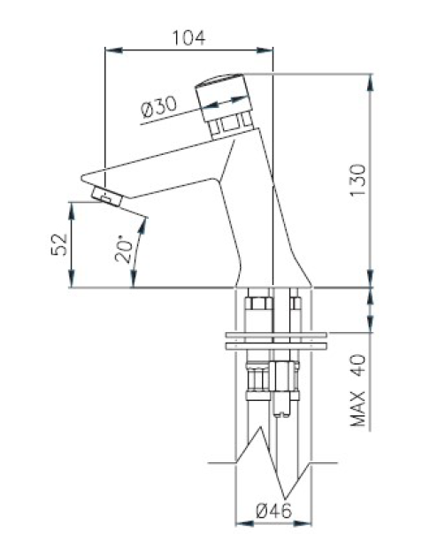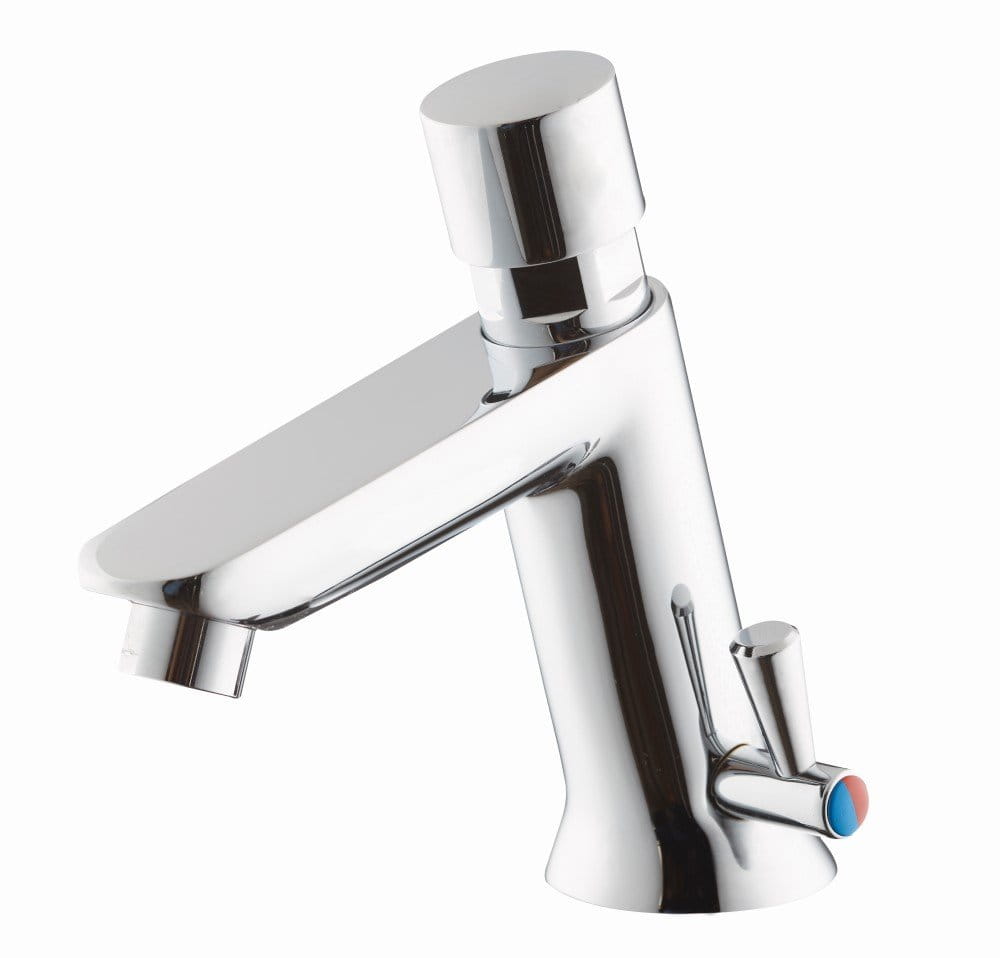 Bateria czasowa umywalkowa z boczną dźwignią do regulacji temperatury wody. Korpus prezentowanej baterii został wykonany z trwałego mosiądzu pokrytego warstwą chromu. W jego bocznej części znajduję się dźwignia służąca do zmiany temperatury wody.