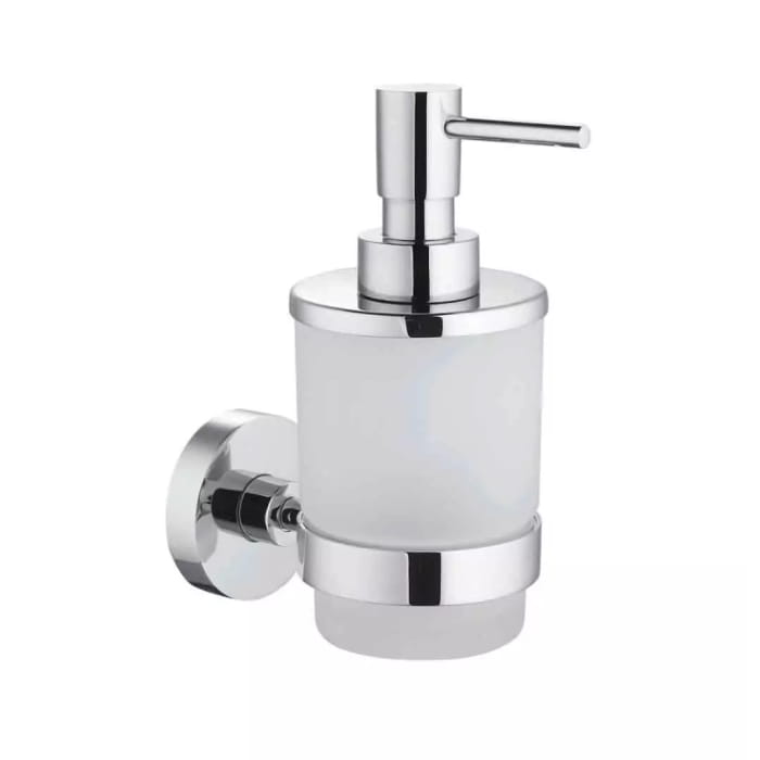 - pojemnik na mydło w płynie ze szkła matowego stabilnie osadzony w uchwycie za pomocą uszczelki z elastycznego tworzywa,
