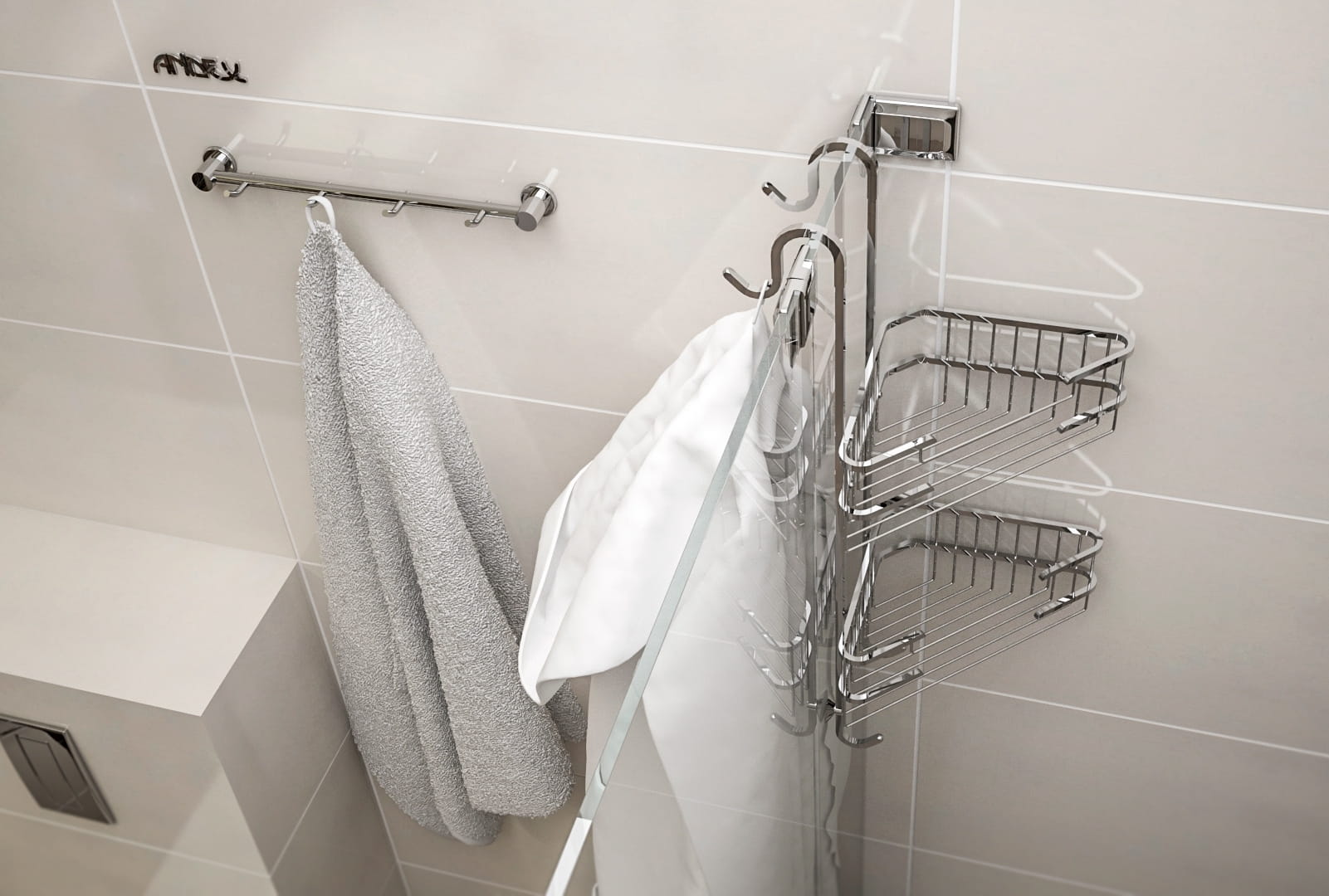 - Kosze prysznicowe dostępne w ofercie można zamontować bez konieczności wiercenia w ścianach. Wystarczy je powieści na drzwiach lub ściankach kabiny prysznicowej. Ponadto na obu końcach występują funkcjonalne wieszaki.