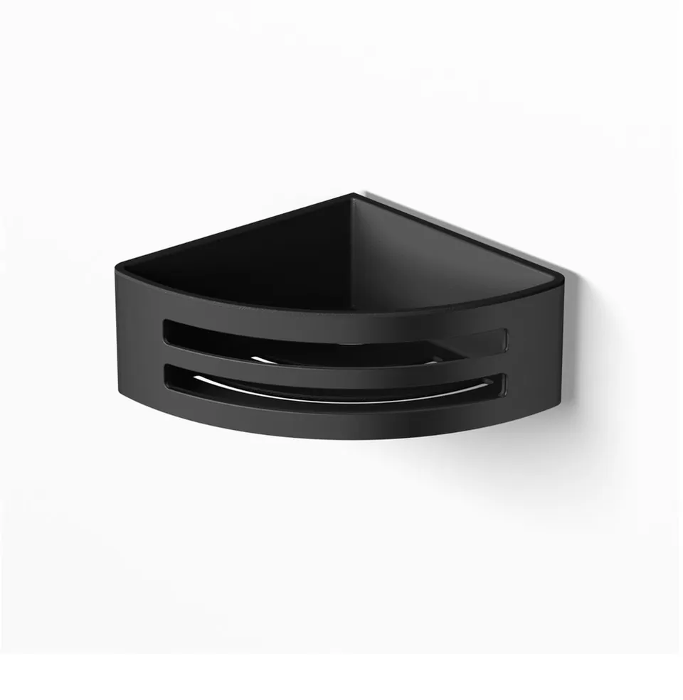 Nowoczesny koszyk narożny do łazienki wykonany z wysokiej jakości stali nierdzewnej, wykończony elegancką matową czernią. Wyposażony w praktyczny, wyjmowany wkład z tworzywa w kolorze czarnym. Idealny do przechowywania kosmetyków i akcesoriów łazienkowych.