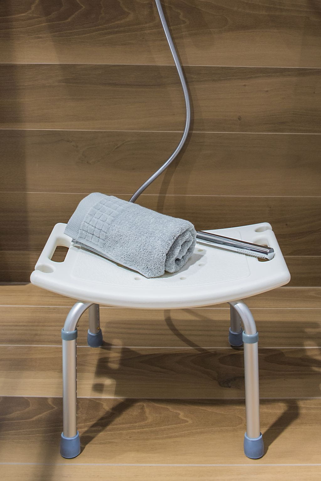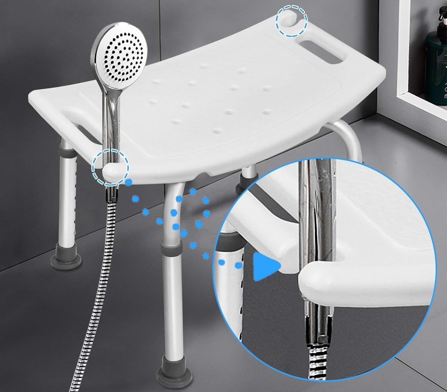 Eleganckie i funkcjonalne krzesło do prysznica / wanny nadające się idealnie do łazienki dla osób starszych lub niepełnosprawnych. Specjalna konstrukcja siedziska do łazienki pozwala na jego użytkowanie również w brodziku lub wannie. Gumowane nakładki na nóżki zapobiegają zarysowaniom powierzchni akrylowych brodzika lub wanny. 8 stopniowa regulacja wysokości siedziska w zakresie od 33.5 cm do 51 cm umożliwia dopasowanie według indywidualnych potrzeb każdego użytkownika. Oferowane krzesło pod prysznic / do wanny posiada również specjalne wyprofilowane dwa uchwyty na słuchawkę prysznicową, co jeszcze bardziej zwiększa jego funkcjonalność.