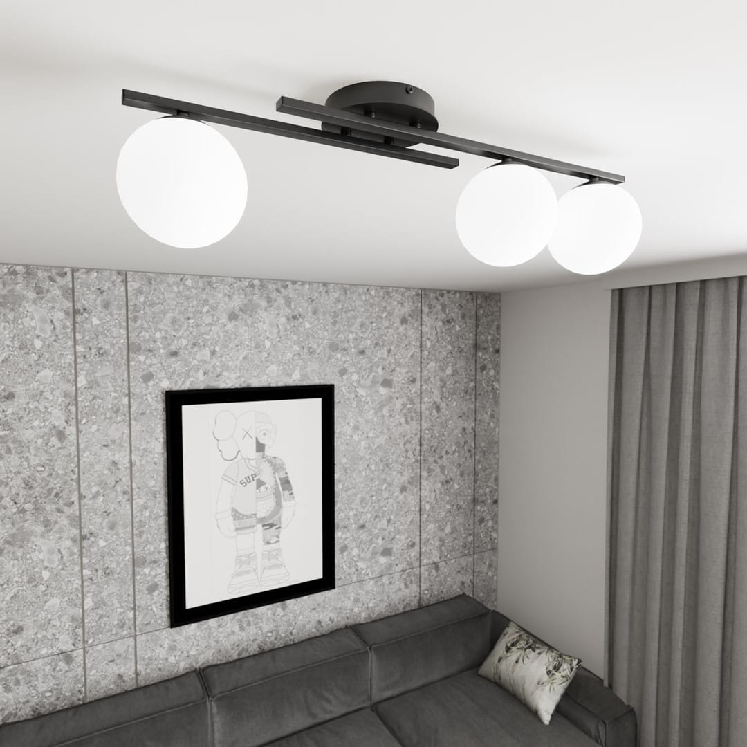 ✅ Nowoczesna lampa sufitowa z kulistymi kloszami na eleganckiej, czarnej konstrukcji.
