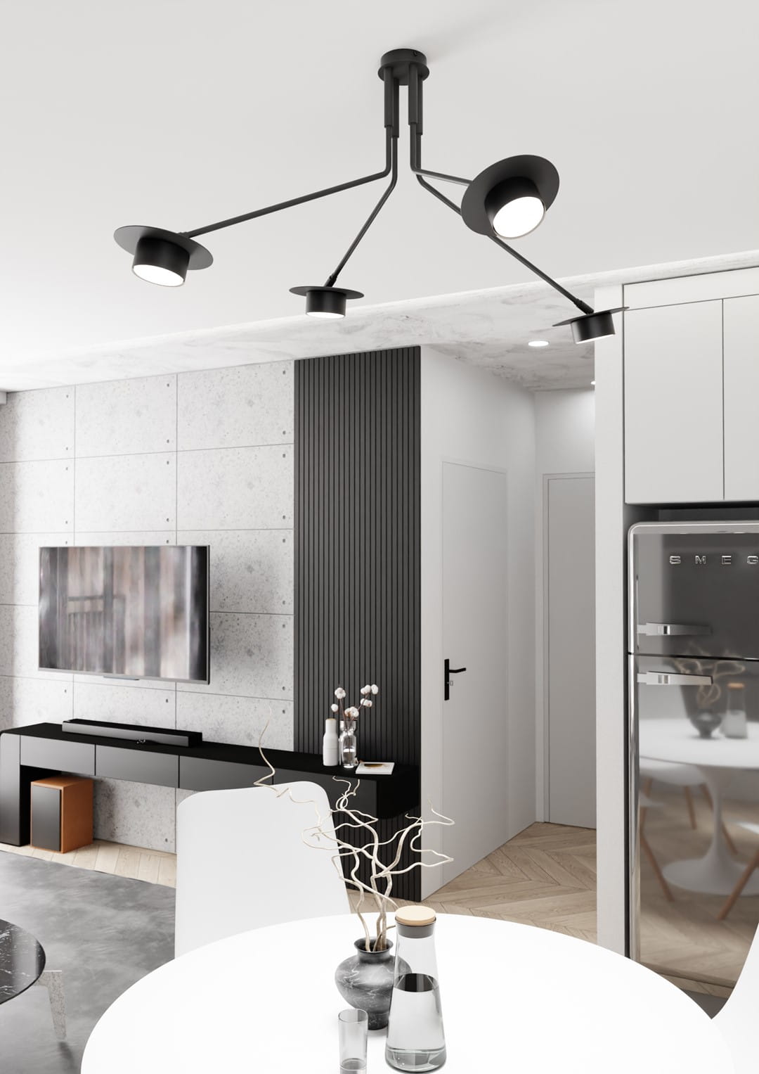 ✅ Czarne, geometryczne ramiona zakończone okrągłymi kloszami tworzą dynamiczną kompozycję, idealnie pasującą do wnętrz w stylu industrialnym i loftowym.