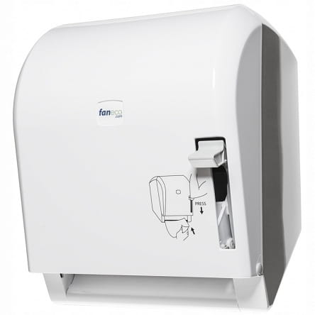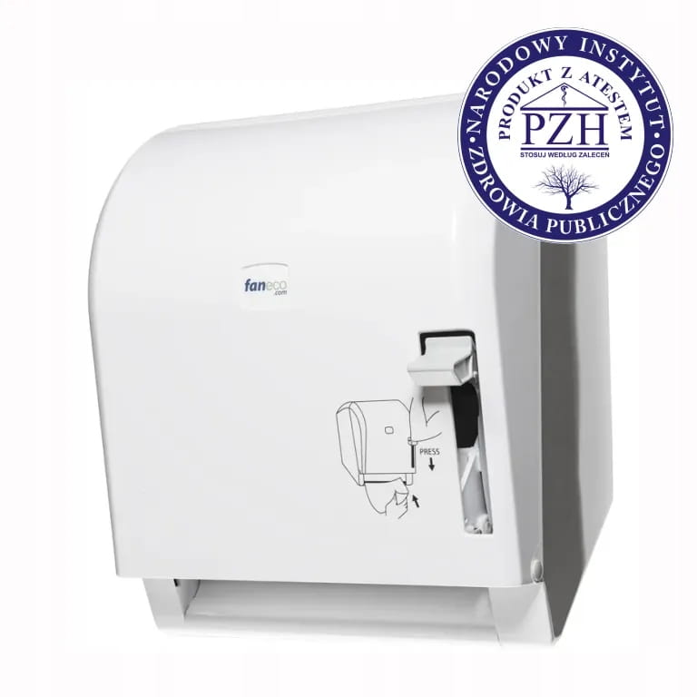 Manualny podajnik ręczników w roli POP wykonany jest z białego, mocnego plastiku ABS. To uniwersalny, naścienny, zamykany na klucz dozownik, mający zastosowanie w różnorodnych toaletach użyteczności publicznej. Jego działanie polega na naciśnięciu dźwigni, która powoduje wysunięcie jednego papierowego listka. Można tego dokonać zarówno dłonią, jak i łokciem, co zwiększa funkcjonalność i higieniczność dozownika ręczników. Umożliwia to również kontrolę ilości wyjmowanego papieru, co podnosi ekonomiczność pojemnika.