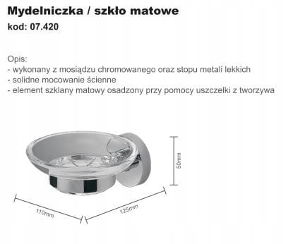 - podstawka na mydło ze szkła matowego stabilnie osadzona w uchwycie za pomocą uszczelki z elastycznego tworzywa,
