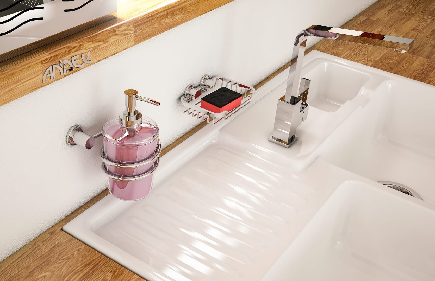- Mydelniczka na mydło w płynie może zostać wykorzystana również w kuchni jako pojemnik na płyn do mycia naczyń, który wraz z mydelniczką ażurową (522,523) zastosowaną do przechowywania przyborów do mycia naczyń takich jak gąbki, druciaki itp. zapewni porządek wokół kuchennego zlewu.