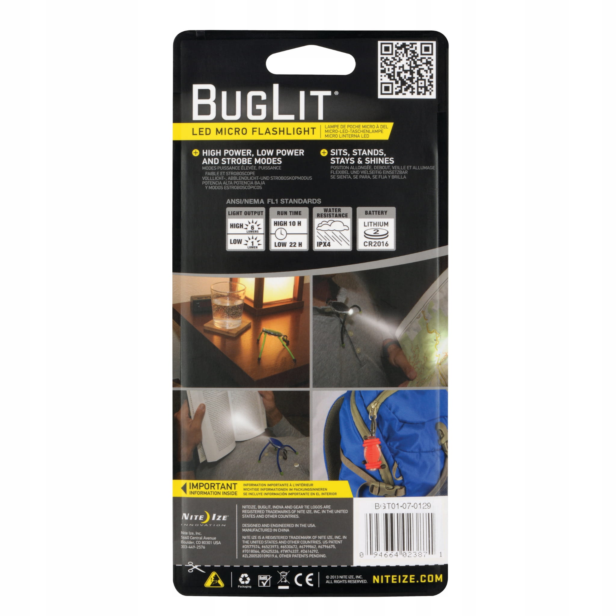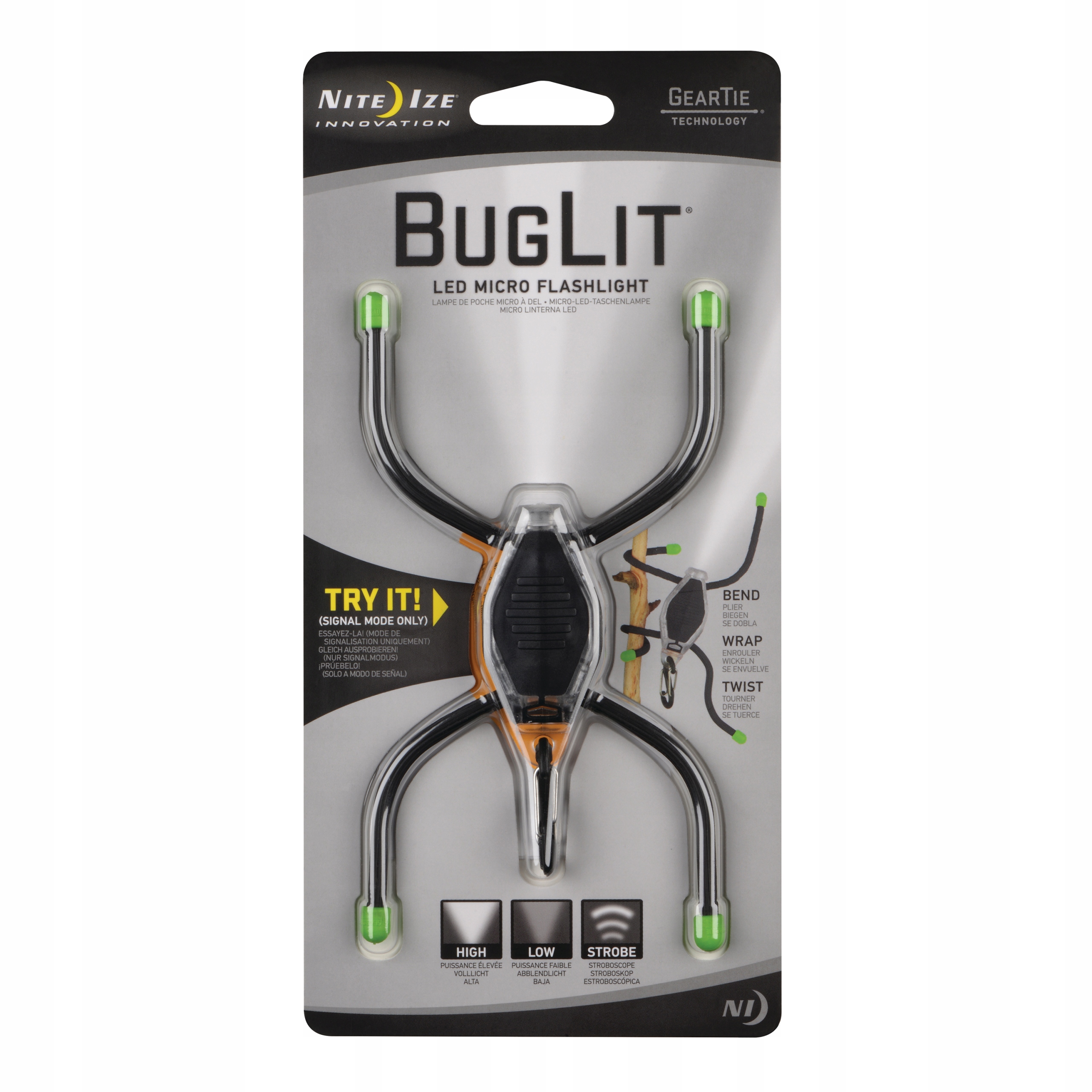 BugLit to podręczna latarka o intensywnym świetle LED. Jej design jest jednocześnie oryginalny i bardzo praktyczny- dzięki gumowym, zginanym uchwytom Gear Tie lampkę możesz łatwo zawiesić lub przymocować w dowolnym miejscu. Dioda LED zapewnia jasne, białe światło o strumieniu 6 lumenów i ma zasięg ponad 15 metrów. Latarka posiada cztery tryby- dwa poziomy jasności światła, stroboskop oraz SOS. Dołączony lekki, plastikowy S-Biner umożliwia przywieszenie do kluczy, szlufki spodni, plecaka czy torebki, dzięki czemu możesz mieć BugLit zawsze przy sobie.