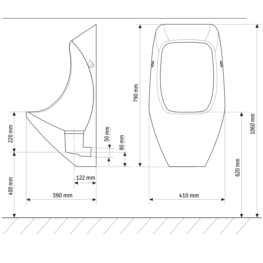 - Wymiary pisuaru - wysokość 800 mm, szerokość 410 mm, głębokość 390 mm.