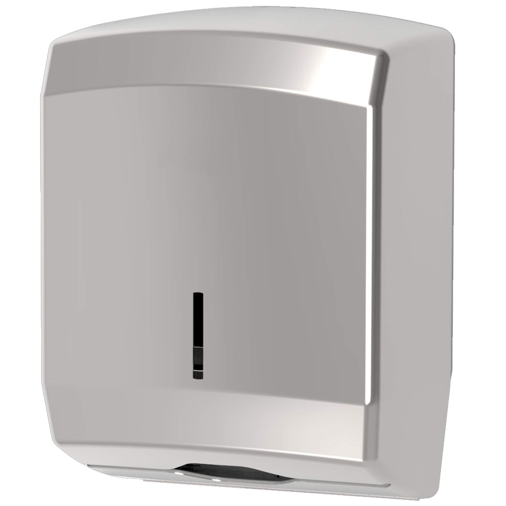 Nowoczesny stalowy dozownik do ręczników składanych w V, ZZ w wykończeniu błysk. Produkowany w Unii Europejskiej charakteryzuje się unikalnym i nowoczesnym wyglądem spełniającym wymagania dzisiejszego rynku utrzymania czystości. Produkowany z poszanowaniem środowiska produkt jest bardzo wysokiej jakości.
