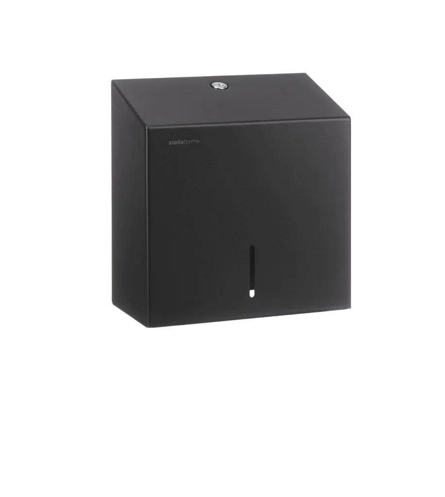 Solidny i estetyczny pojemnik na papier toaletowy w dużej roli z serii R10, przeznaczony do użytku w toaletach publicznych o dużym natężeniu ruchu. Wykonany z wysokiej jakości stali nierdzewnej czarny mat, zapewnia trwałość, odporność na wilgoć oraz nowoczesny wygląd.