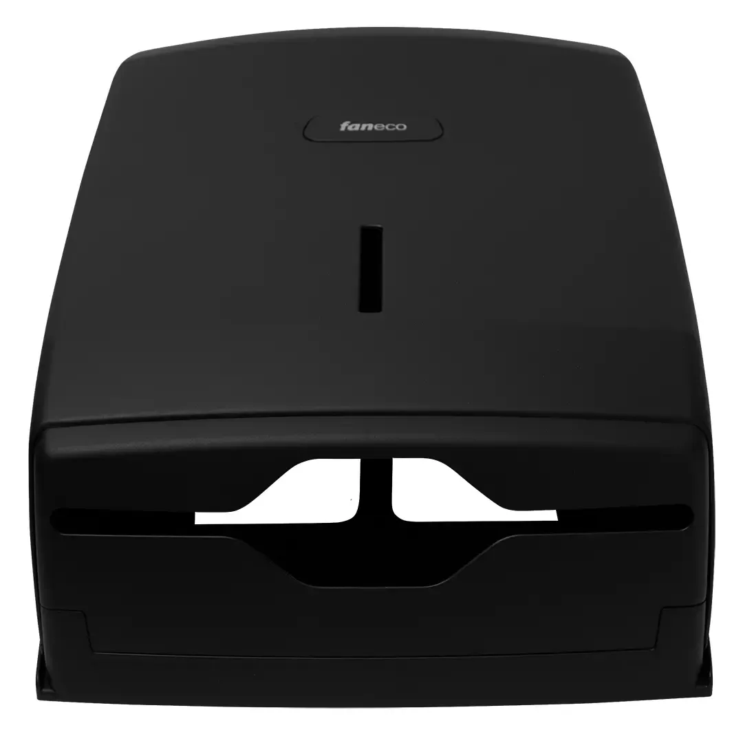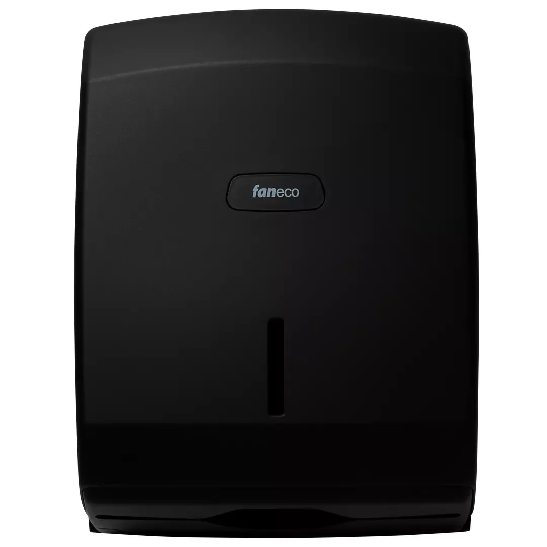 Dozownik Calma Black jest przystosowany do łazienek o dużym natężeniu ruchu, oferując pojemność na 600 usług. Ręczne dozowanie pozwala na łatwe i szybkie pobieranie ręczników, a otwór do podglądu zawartości umożliwia bieżące monitorowanie poziomu papieru, co zapobiega nagłemu braku materiału.