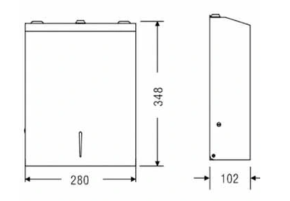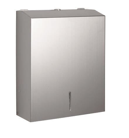 Podajnik ręczników papierowych wykonany ze stali nierdzewnej. Wykończenie matowe. Pojemność: 400-600 złożonych ręczników ZZ. Zamykany na kluczyk. Krawędzie szlifowane. Dystrybucja: 1 ręcznik papierowy. Posiada okienko do podglądu pozostałej ilości papieru.