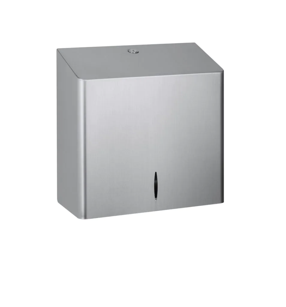 Wytrzymały i pojemny dozownik na ręczniki papierowe składane z serii R10 to praktyczne rozwiązanie dla toalet i pomieszczeń w obszarach publicznych o dużym natężeniu ruchu. Wykonany z wysokiej jakości stali nierdzewnej o powierzchni szczotkowanej (matowej), zapewnia trwałość, odporność na uszkodzenia oraz elegancki wygląd.