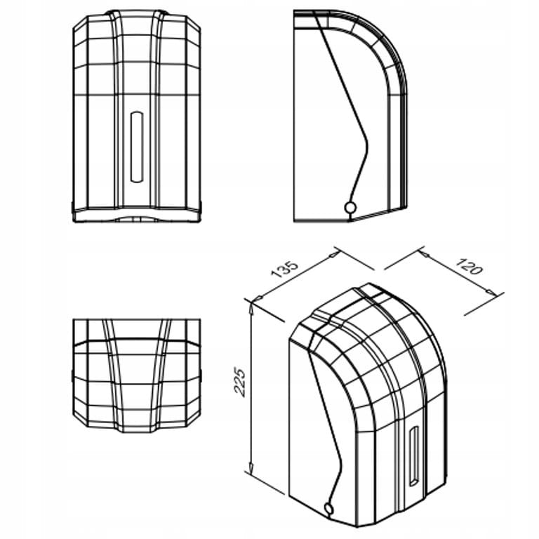 - Wymiary pojemnika - wysokość 225 mm, szerokość 135 mm, głębokość 120 mm