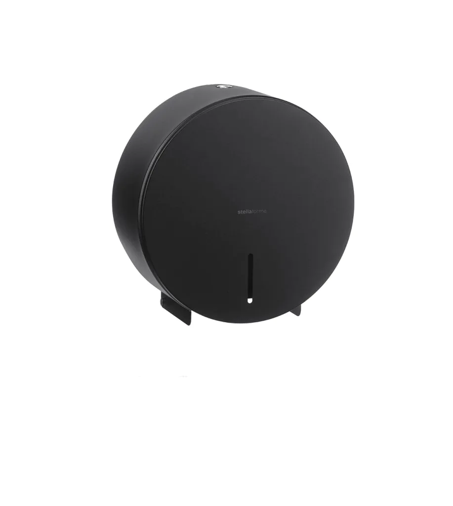 Elegancki i funkcjonalny pojemnik na papier toaletowy w dużej roli z serii R1, przeznaczony do toalet publicznych o dużym natężeniu ruchu. Wykonany z wysokiej jakości stali nierdzewnej malowanej proszkowo na kolor czarny mat, doskonale łączy trwałość z nowoczesnym designem.