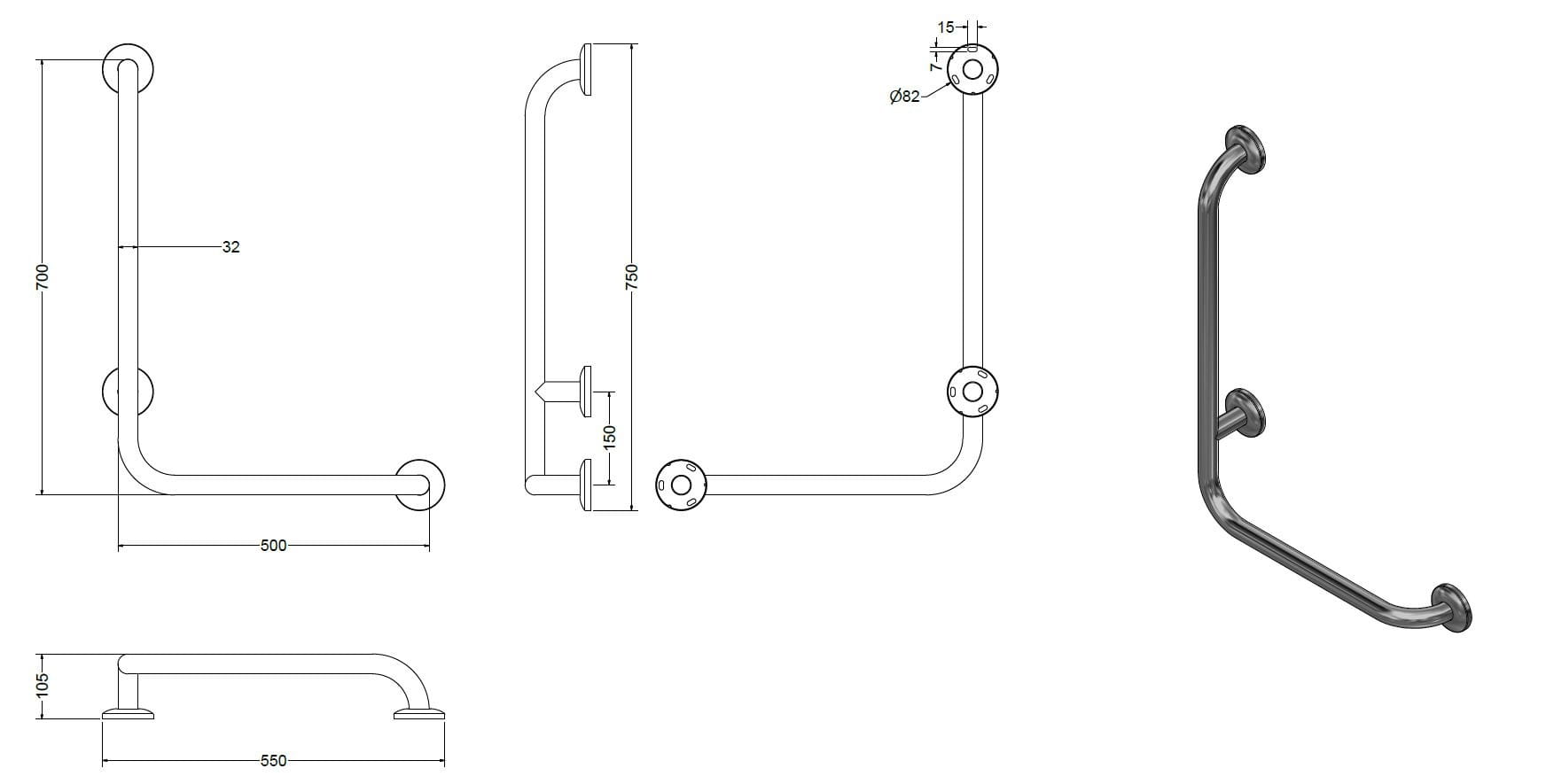 Prezentowana poręcz ma zastosowanie w strefie umywalkowej, prysznicowej oraz wc. Rurka służąca do jej wyprodukowania jest wykonana ze stali nierdzewnej AISI 304 o średnicy 32 mm.Interesującym rozwiązaniem jest zastosowanie systemu zatrzaskowego w rozetach maskujących. Pozwala to zamontować rozety bez użycia kleju montażowego.