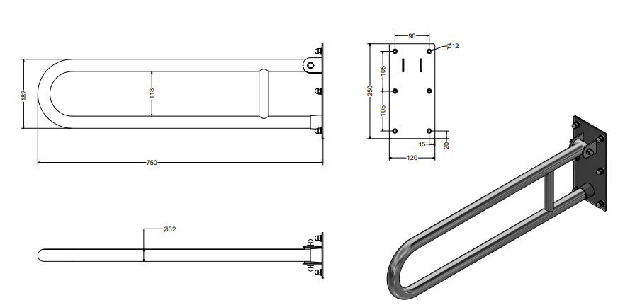 Poręcz dla niepełnosprawnych łukowa uchylna 75cm Ø32 mm