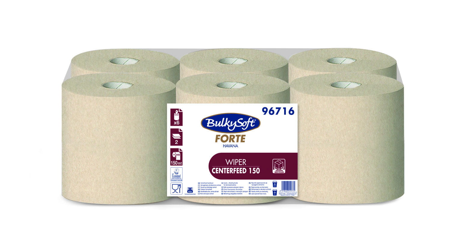 Ekologiczne ręczniki papierowe w roli centralnego dozowania Bulkysoft HAVANA FORTE mają długość 150 m i podzielone są na 442 odcinków równej długości. Ręcznik można dozować z podziałem na listki, których odrywanie umożliwia specjalna perforacja. Dodatkowo może być stosowany w sposób nieograniczony - użytkownik sam decyduje o długości potrzebnego fragmentu. Ręczniki papierowe w roli są w kolorze naturalnym, z delikatnym gofrowaniem. Naturalny, ciepły i miły dla oka kolor papieru od razu sugeruje gościom, że korzystają z produktu ekologicznego. Posiadają dwie warstwy wysokiej jakości papieru uzyskanego z recyklingu kartonów. Są wyjątkowo chłonne i wytrzymałe, a jednoczenie nie rolują się podczas używania i nie rozrywają. Miłe w dotyku, miękkie i bezpieczne zarówno dla skóry, jak i żywności, z którą mogą mieć styczność. Są wydajne i praktyczne - idealne do pomieszczeń z średnim i dużym natężeniem użytkowania.