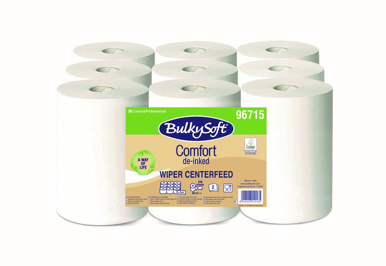 Ręcznik mini w roli centralnego dozowania firmy Bulkysoft dopasowany jest do dozowników tej samej firmy. Stworzony z dwóch warstw wytrzymałego, ale jednocześnie miękkiego i delikatnego papieru, wykonanego z celulozy z dodatkiem celulozy z recyklingu. Można korzystać z niego bez ograniczeń lub dozować listek po listku. Posiada perforacje, które umożliwiają łatwe odrywanie cząstek ręcznika. Świetnie nadaje się do wycierania rąk oraz innych przedmiotów. Nie pozostawia śladów i nie roluje się podczas użytkowania. Przeznaczony do miejsc o małym natężeniu ruchu. Wszystkie ręczniki w roli firmy Bulkysoft de-inkes podsiadają certyfikat dopuszczający produkt do kontaktu z żywnością i certyfikat Ecolabel.