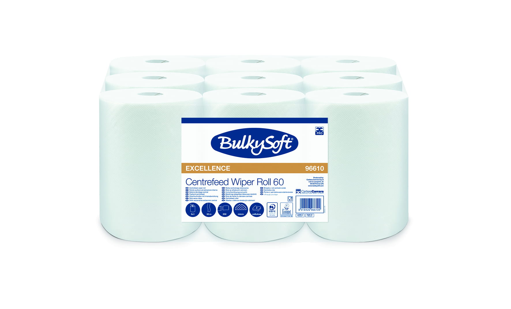 Ręcznik w roli centralnego dozowania formy Bulkysoft dopasowany jest do dozwoników tej samej firmy. Ręcznik papierowy jest w kolorze białym, posiada wytłoczenia. Stworzony z dwóch warstw wytrzymałego, ale jednocześnie miękkiego i delikatnego papieru, wykonanego z czystej, selekcjonowanej celulozy. Można korzystać z niego bez ograniczeń lub dozować listek po listku. Posiada perforacje, które umożliwiają łatwe odrywanie cząstek ręcznika. Świetnie nadaje się do wycierania rąk oraz innych przedmiotów. Nie pozostawia śladów i nie roluje się podczas użytkowania. Przeznaczony do miejsc o małym natężeniu ruchu. Wszystkie ręczniki w roli firmy Bulkysoft podsiadają certyfikat ISEGA dopuszczający produkt do kontaktu z żywnością.