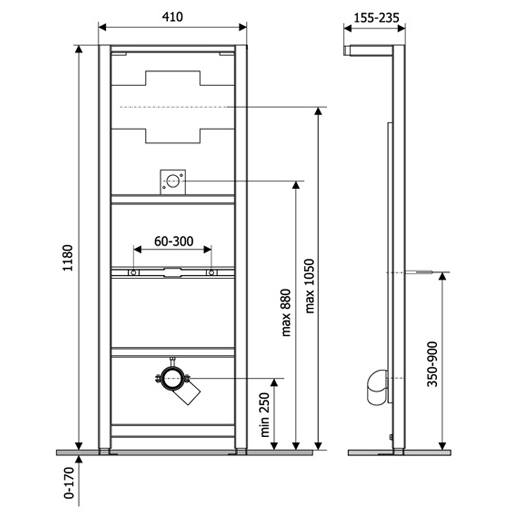 Wymiary stelaża: Wysokość 1120 - 1290 mm, szerokość 400 mm, głębokość 155 - 235 mm