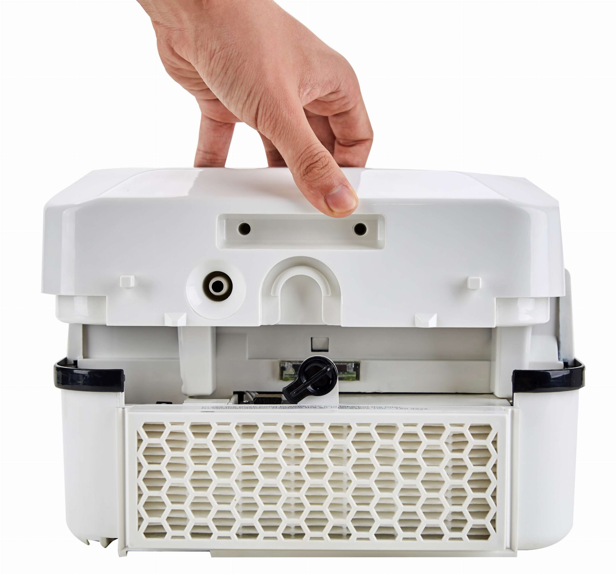 Suszarka do rąk HS603 wyposażona jest również w filtr HEPA umieszczony pod zbiornikiem z wodą, co bardzo ułatwia wymianie go na nowy.