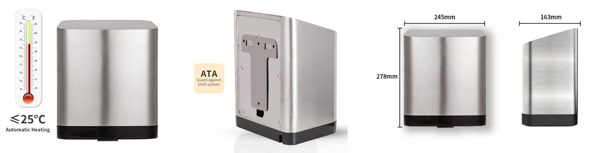 Nowoczesna, wykonana z stali suszarka do rąk. Wysokoobrotowa suszarka z szybkim silnikiem z czasem suszenia 10-15 s Staranie wykonana o szczelność CR4305 która umożliwia czyszczenie łagodnym detergentem. Suszarka zawiera wysokiej jakości filtr HEPA z wydajność 99,50%