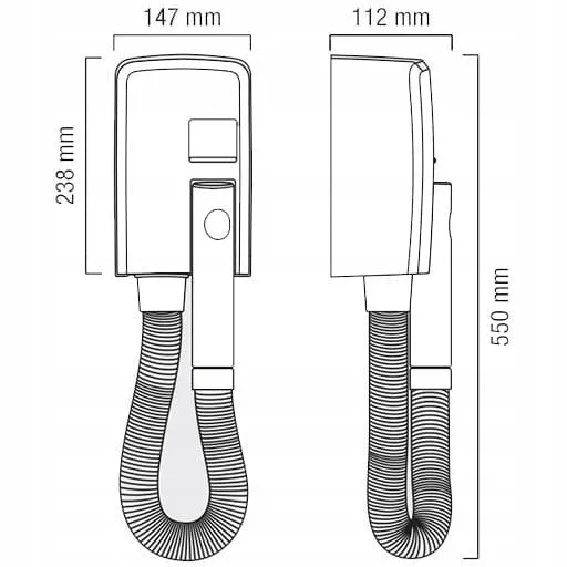 - Wymiary suszarki: Wysokość 238 mm (wysokość wraz z wężem 550 mm), szerokość 147 mm, głębokość 112 mm