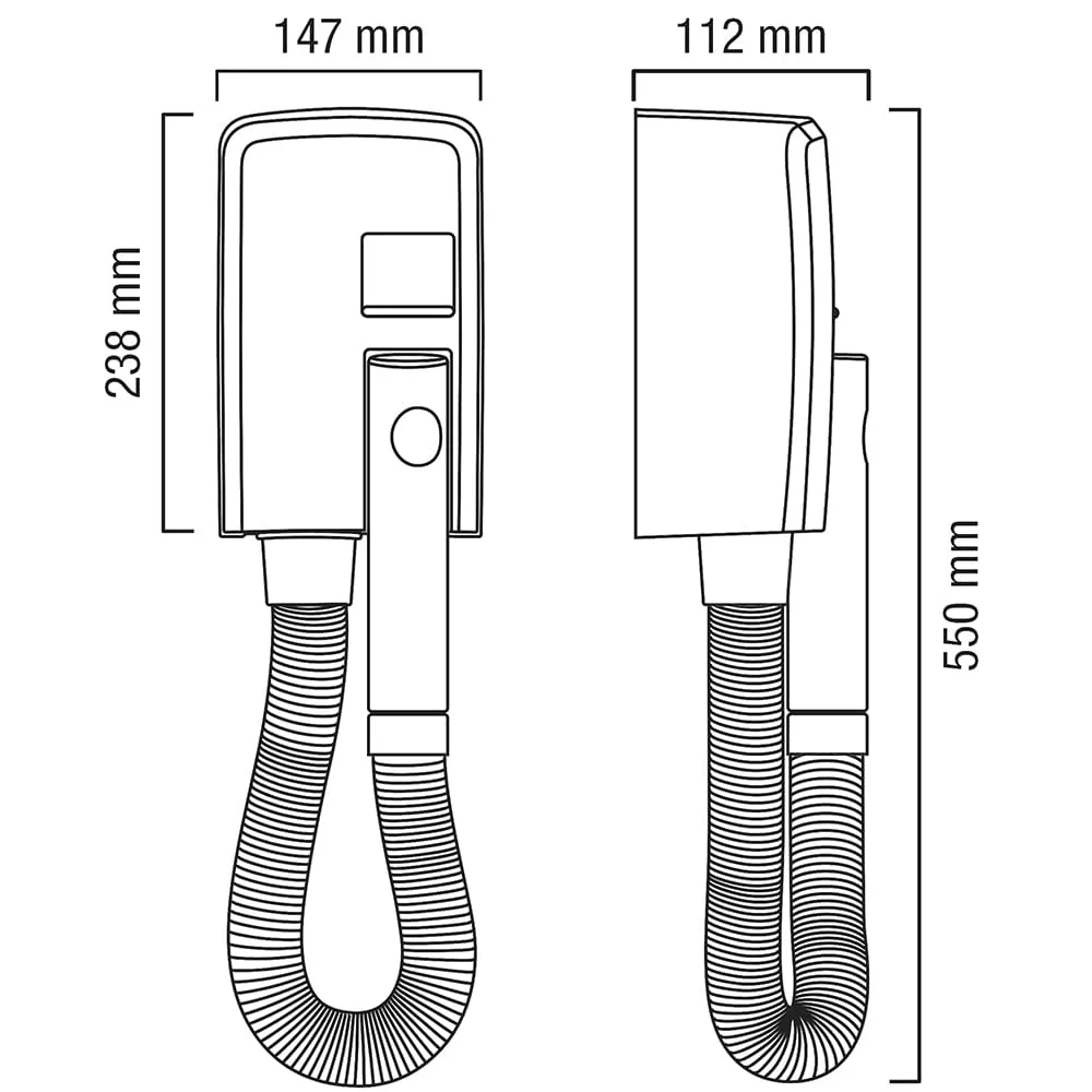 - Wymiary suszarki: Wysokość 238 mm (wysokość wraz z wężem 550 mm), szerokość 147 mm, głębokość 112 mm
