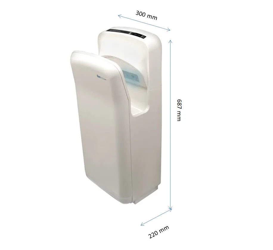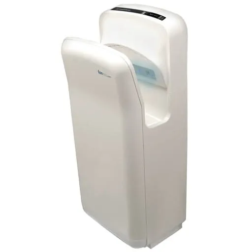 Suszarka do rąk 1900W Monsun wykonana jest z bardzo mocnego, białego plastiku ABS. Pokryta jest antybakteryjną powłoką, zapewniającą użytkownikom najwyższy stopień higieny. Jak wszystkie suszarki strumieniowe różni się od tradycyjnych sposobem suszenia dłoni. Mokre ręce umieszcza się w przestrzeni przypominającej kieszeń (stąd suszarki określa się również kieszeniowymi), co automatycznie uruchamia suszarkę do działania. Z wąskich szczelin wylatuje z dużą prędkością powietrze, które w krótkim czasie ściąga wodę z dłoni. Monsun jest więc wysokiej klasy urządzeniem, które równocześnie zapewnia skuteczność działania, jak i niskie koszty eksploatacji. Idealnie pasuje do toalet o średnim i dużym natężeniu ruchu.