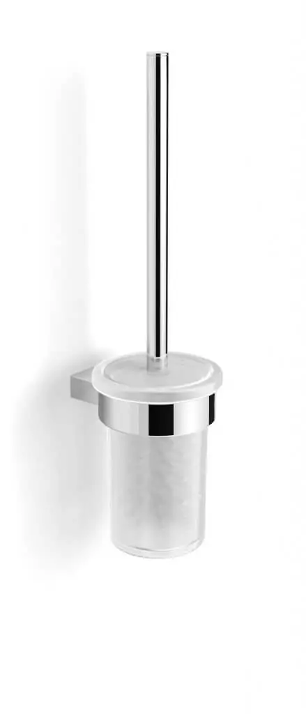 Elegancka szczotka WC wisząca wykonana z metalu z powierzchnią w kolorze chromu. Pojemnik ze szkła matowego stabilnie osadzony w uchwycie dzięki uszczelce z elastycznego tworzywa. Szczotka wyposażona jest w pokrywkę zasłaniającą wnętrze pojemnika, co podnosi estetykę i higienę użytkowania. Główka szczotki w kolorze białym. Montaż ścienny z ukrytym mocowaniem zapewnia nowoczesny wygląd i łatwość utrzymania czystości.