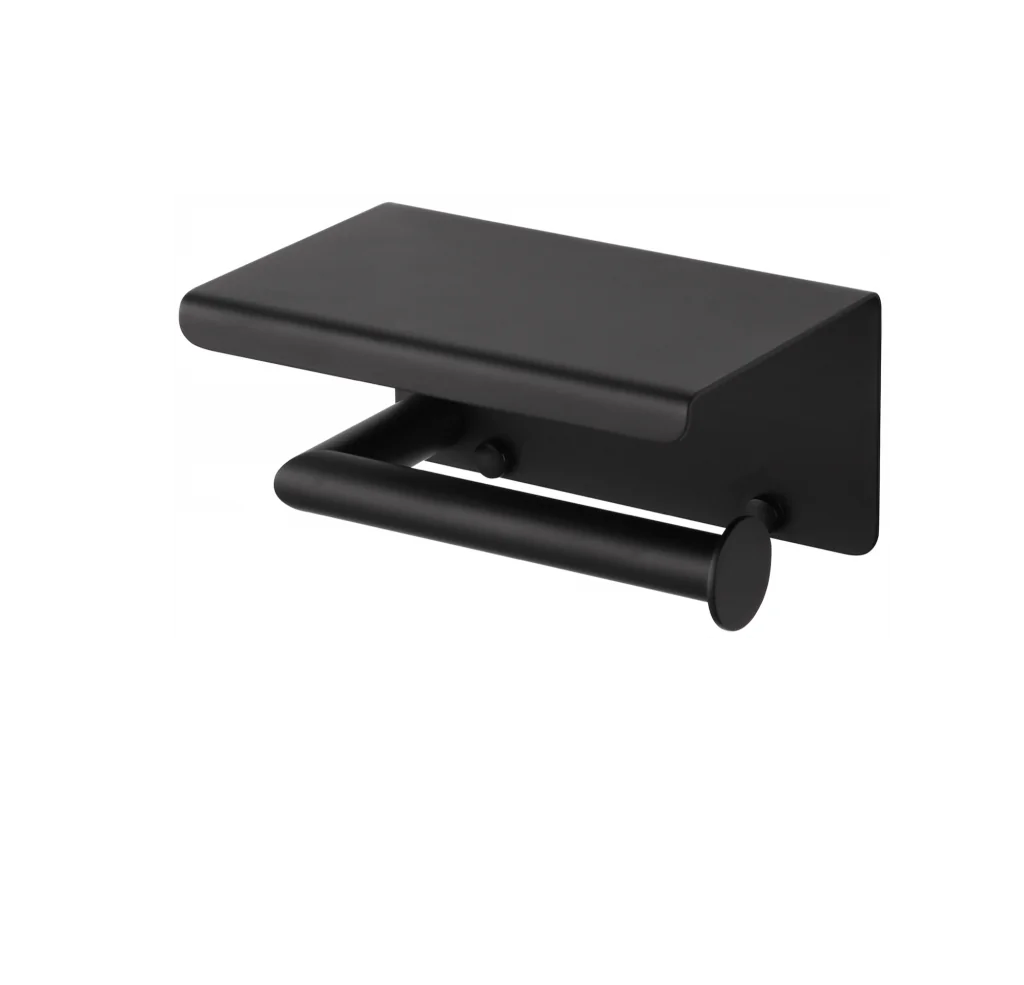 Nowoczesny i funkcjonalny uchwyt na papier toaletowy z praktyczną półką na telefon lub drobne akcesoria. Wykonany z połączenia stali nierdzewnej i mosiądzu, pokryty eleganckim czarnym matem, świetnie wpisuje się w aranżacje nowoczesnych łazienek.